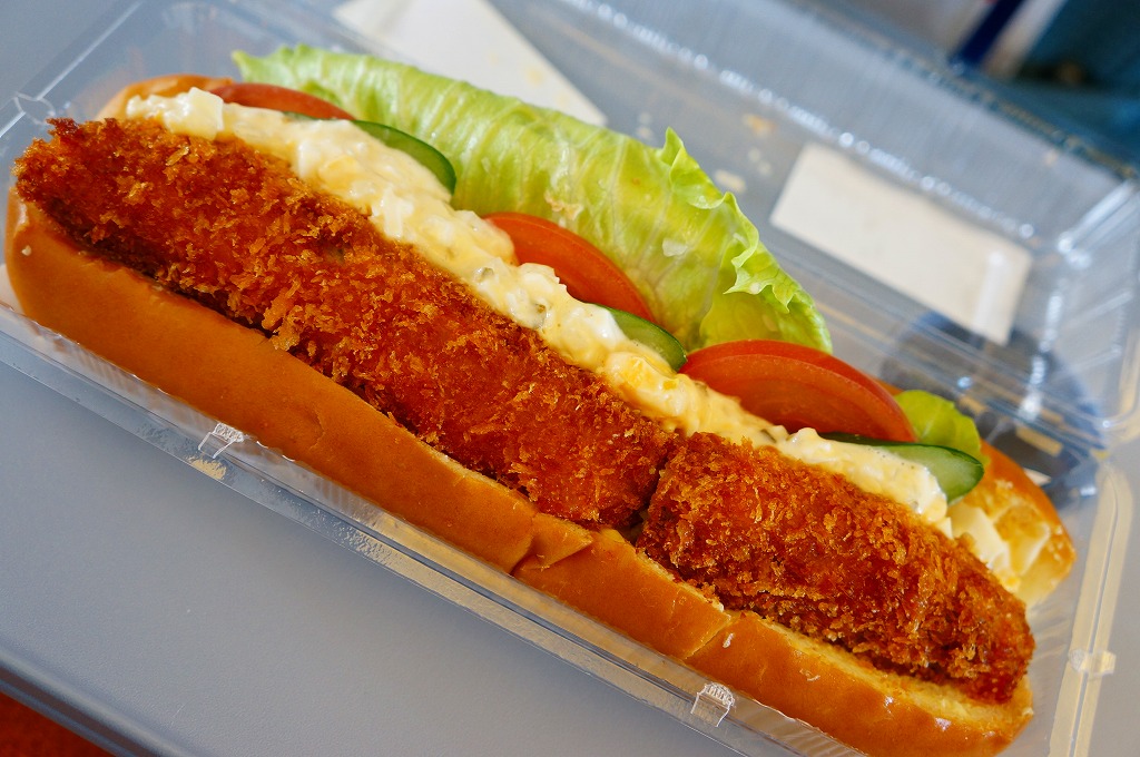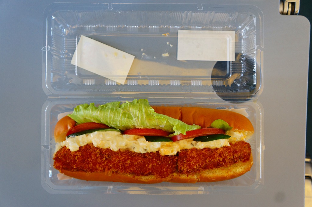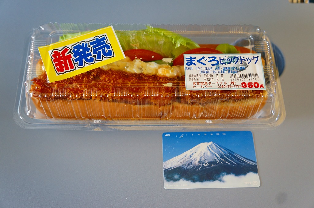宮古空港カフェスタンドの惣菜のひとつ。見てのとおり、日本中の屋台やスーパーで買えるジャンクフード。太麺に厚めの豚肉とキャベツを合わせて、甘めのソースをたっぷりかけて炒められていた。宮古風あるいは宮古島風の焼そばとは、沖縄そばの中でも宮古そばと呼ばれるものに使われる細めの角麺を使った焼きそばのことか。 【宮古空港】1943(昭和18)年6月開港 沖縄県宮古島市平良字下里 http://www.miyakoap.co.jp/ 【郷土料理かーらやー】沖縄県宮古島市平良字下里1657−128 0980(75)4737 まぐろビッグドッグ(350円) 2012年4月7日に宮古空港搭乗待合室カフェスタンドで購入