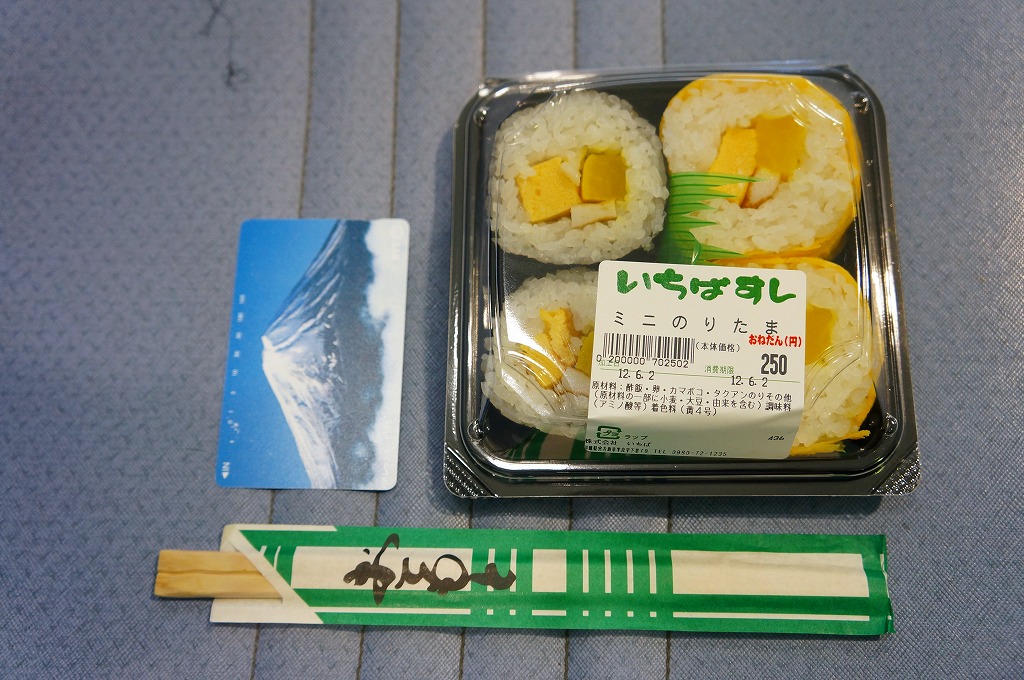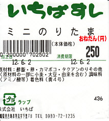 宮古空港カフェスタンドの惣菜のひとつ。耳を落とした食パンにハム、タマゴ、レタスを挟み、正方形に小さく切り刻んで透明なプラ製惣菜容器に詰めたもの。これに沖縄や宮古はどこにもないと思うが、コンビニエンスストアやセントラルキッチンが全盛の世の中で、こういう手作りを市販品で買えることは、離島ならではないだろうか。調製元は宮古空港の中の食堂。 【宮古空港】1943(昭和18)年6月開港 沖縄県宮古島市平良字下里 http://www.miyakoap.co.jp/ 【すなかぎ】所在地の記載なし 0980(73)3913 ミニのりたま(250円) 2012年6月2日に宮古空港搭乗待合室カフェスタンドで購入