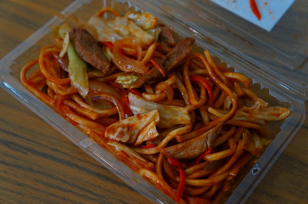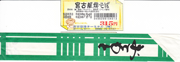 宮古空港カフェスタンドの惣菜のひとつ。具に玉子焼とカマボコとタクアンのみを使った太巻きで、海苔巻が2個と玉子巻が2個。蛍光イエローのタクアンを寿司の具にするなんて、平成や21世紀の人達には衝撃を与えるのではないかと思う。それだけでとてもチープな惣菜に感じる。調製元は宮古島平良の弁当店。 【宮古空港】1943(昭和18)年6月開港 沖縄県宮古島市平良字下里 http://www.miyakoap.co.jp/ 【株式会社いちば】沖縄県宮古島市平良字下里78 0980(72)1235 http://ichiba.biz/ 宮古風焼そば(315円) 2012年4月7日に宮古空港搭乗待合室カフェスタンドで購入