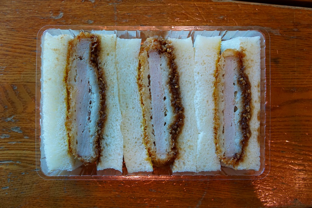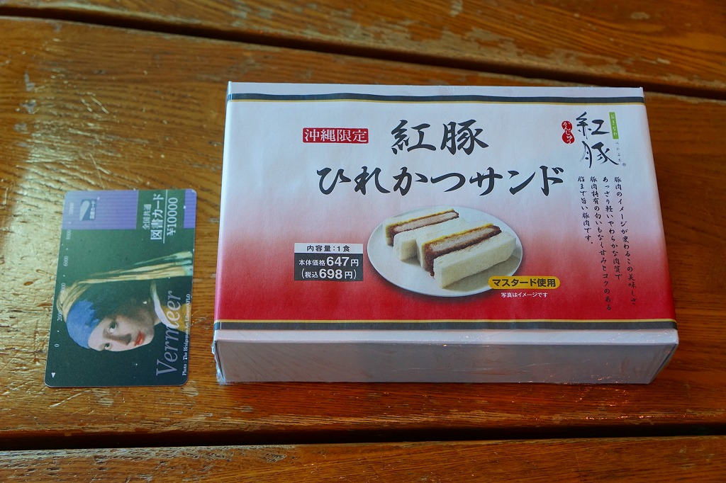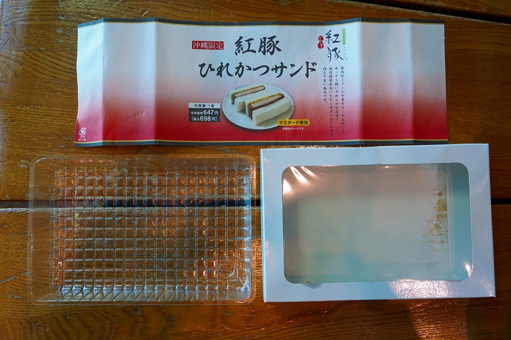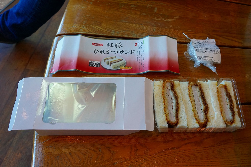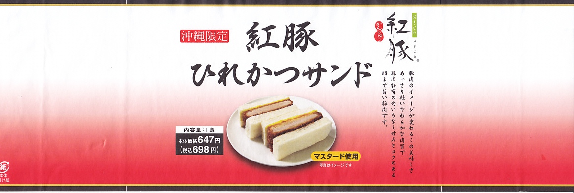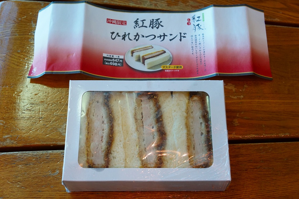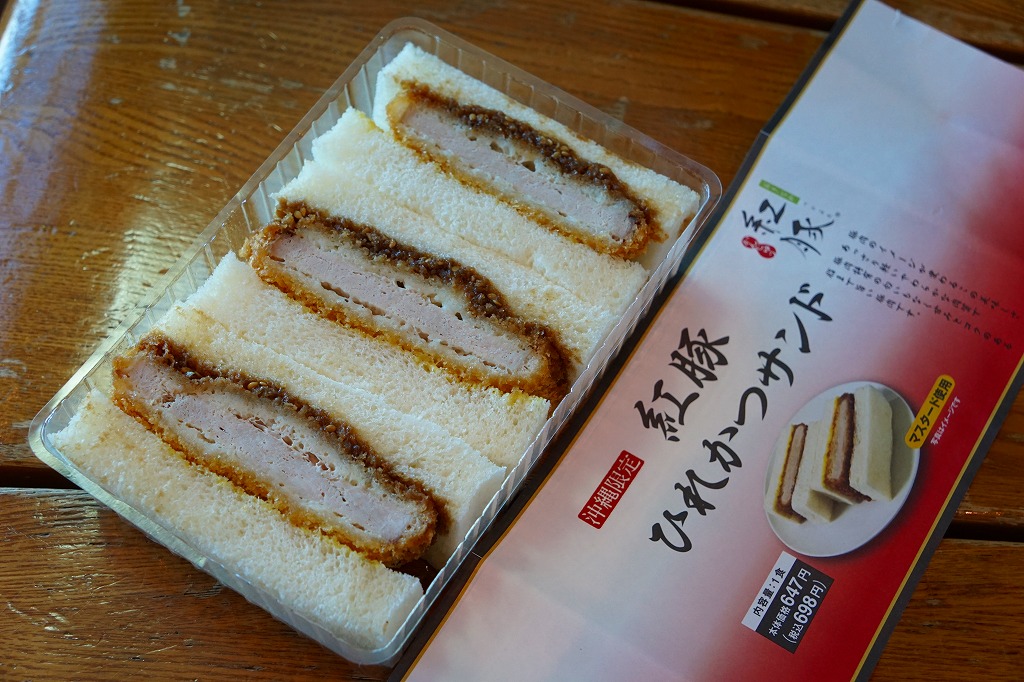 訪問時点で最高額のファミリーマート那覇空弁。黒い掛紙にはお品書きが記される。9区画の中身は、油みそのせごはん、タコライス、「ジューシー」なる沖縄風炊込飯、ゴーヤーチャンプルー、からし菜いためと冬瓜(トウガン)の煮物、鶏唐揚、島豆腐の白和えとクーブイリチーなる昆布などの炒め物、煮卵と三枚肉煮付け、紅芋ごま団子。文字では沖縄の味が詰まるように見えて、味噌も豚肉もゴーヤーも昆布も、全体的にも本土の味という感じ。きっとコンビニで郷土料理というのは、ここでもどこでもニーズに合わないのだろう。 【那覇空港】1933(昭和8)年8月開港 沖縄県那覇市字鏡水 http://www.naha-airport.co.jp/ 【株式会社みなと食品沖縄】沖縄県那覇市港町3−4−18 0120-71-8505 紅豚ひれかつサンド(698円) 2015年6月14日に那覇空港国内線ターミナルビル内ファミリーマートで購入