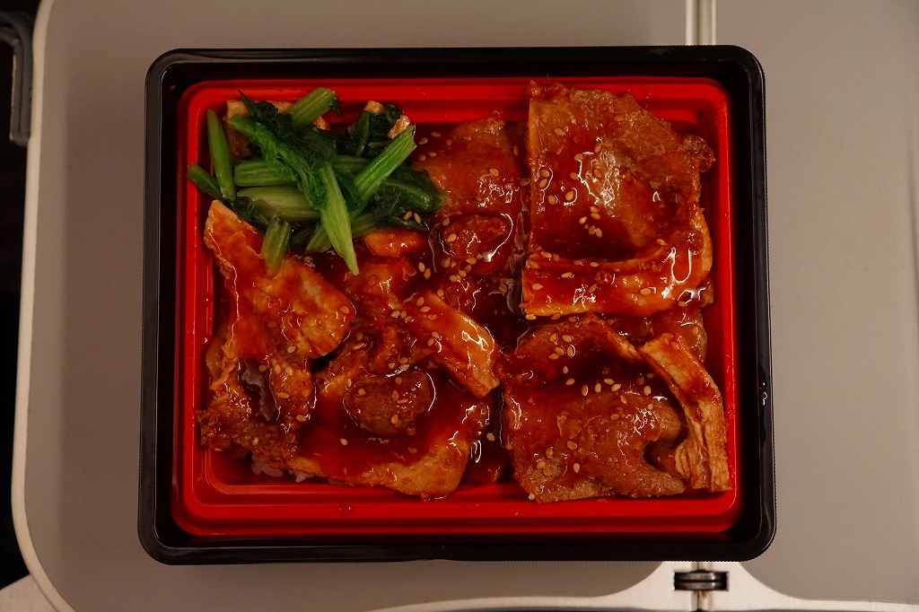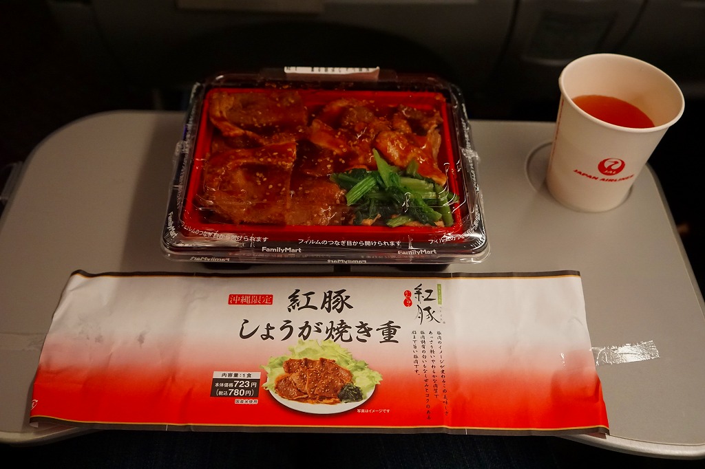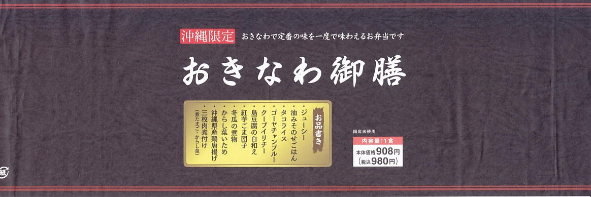 見てのとおりの豚丼。プラ製容器に白御飯を敷き、タマネギ炒めを介して豚焼肉で覆い、からし菜を添える。やはり見てのとおり、生姜入りのタレを大量に絡めているため、肉の味はどこかへ飛んでしまい、タレの強く刺激的な味しかしなかった。「紅豚」とは、株式会社がんじゅうが商標を持つ豚肉で、飼育環境と飼料と味と特徴にこだわりがあるのだという。 【那覇空港】1933(昭和8)年8月開港 沖縄県那覇市字鏡水 http://www.naha-airport.co.jp/ 【ジーケイフーズ株式会社】沖縄県宜野湾市志真志4−31−8 0120-42-2632 おきなわ御膳(980円) 2015年6月14日に那覇空港国内線ターミナルビル内ファミリーマートで購入