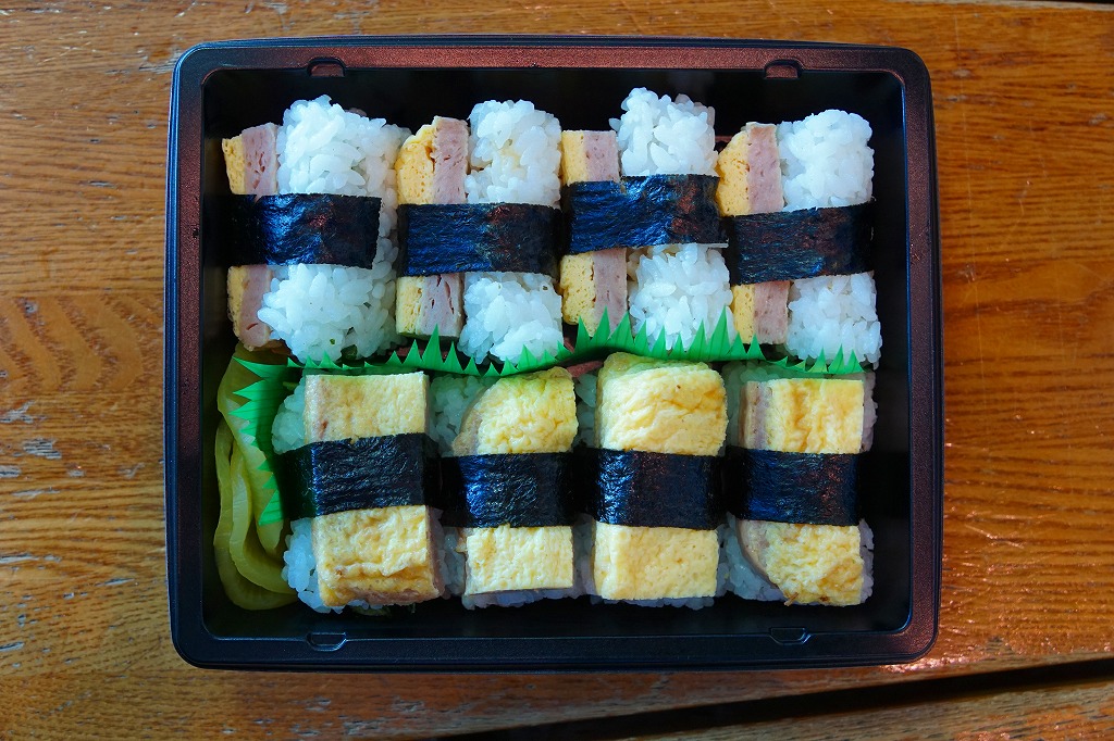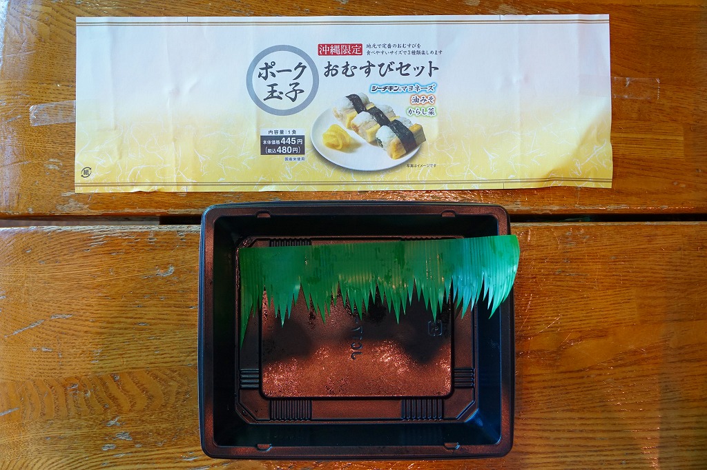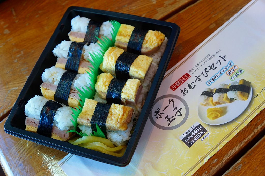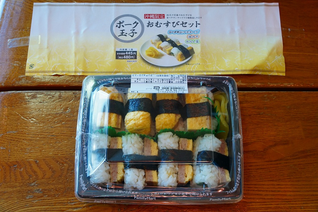 ファミリーマートの那覇空弁の箱サンド。これは2009年7月18日発売の商品の再登板である模様。商品名のとおり、紅豚ひれかつサンドを3切れ、透明なトレーにぴったり詰めて、窓付きの紙箱にはめて、見本写真入りの掛紙を巻く。ごま入りソースと粒マスタード入りソースと厚い衣で味付けられたカツは、そのものには味も臭みもない感じで、これもやはり東京の味かなと感じた。 【那覇空港】1933(昭和8)年8月開港 沖縄県那覇市字鏡水 http://www.naha-airport.co.jp/ 【ジーケイフーズ株式会社】沖縄県宜野湾市志真志4−31−8 0120-42-2632 ポーク玉子おむすびセット(480円) 2015年6月14日に那覇空港国内線ターミナルビル内ファミリーマートで購入