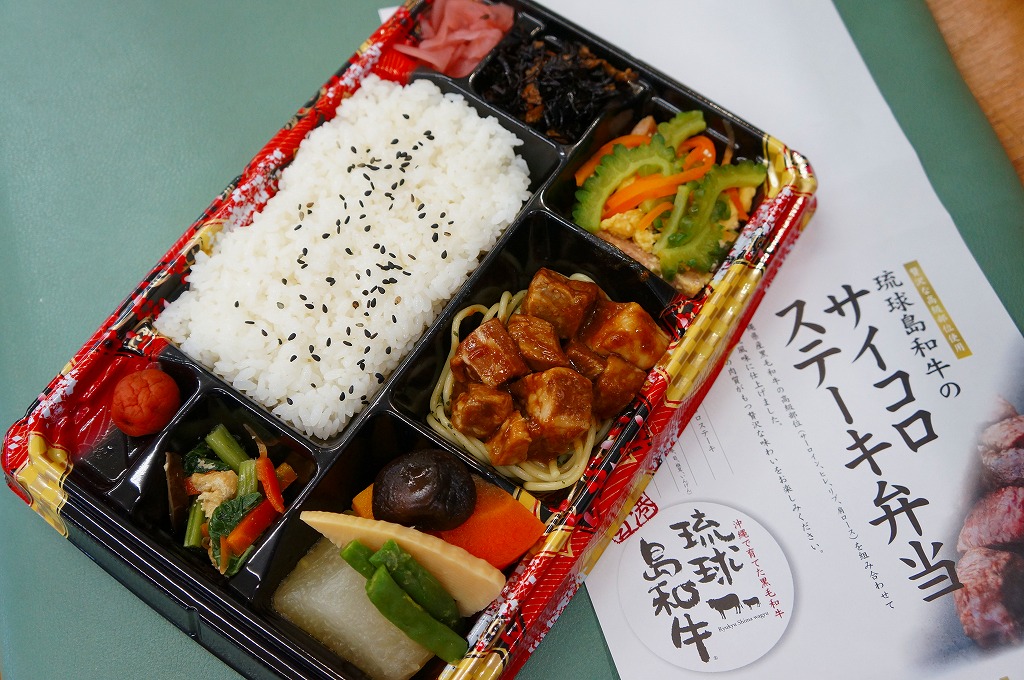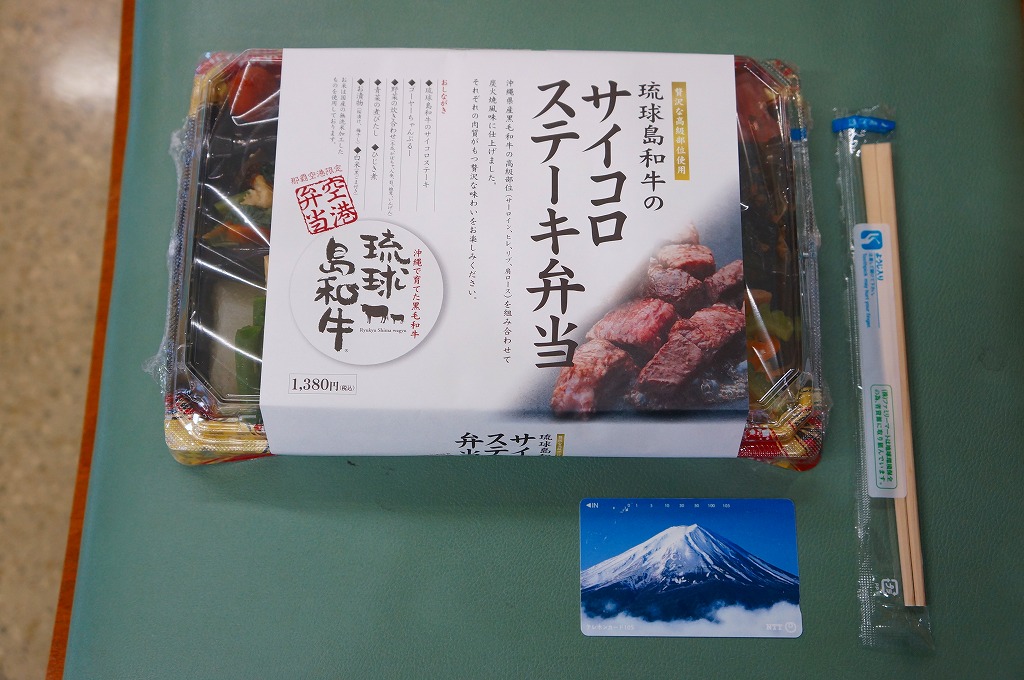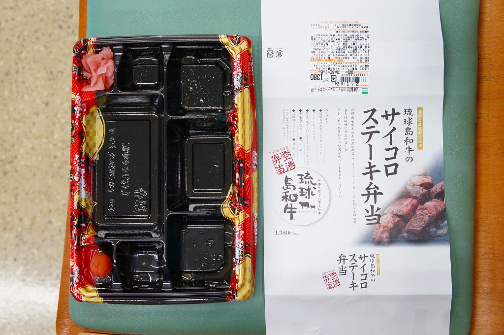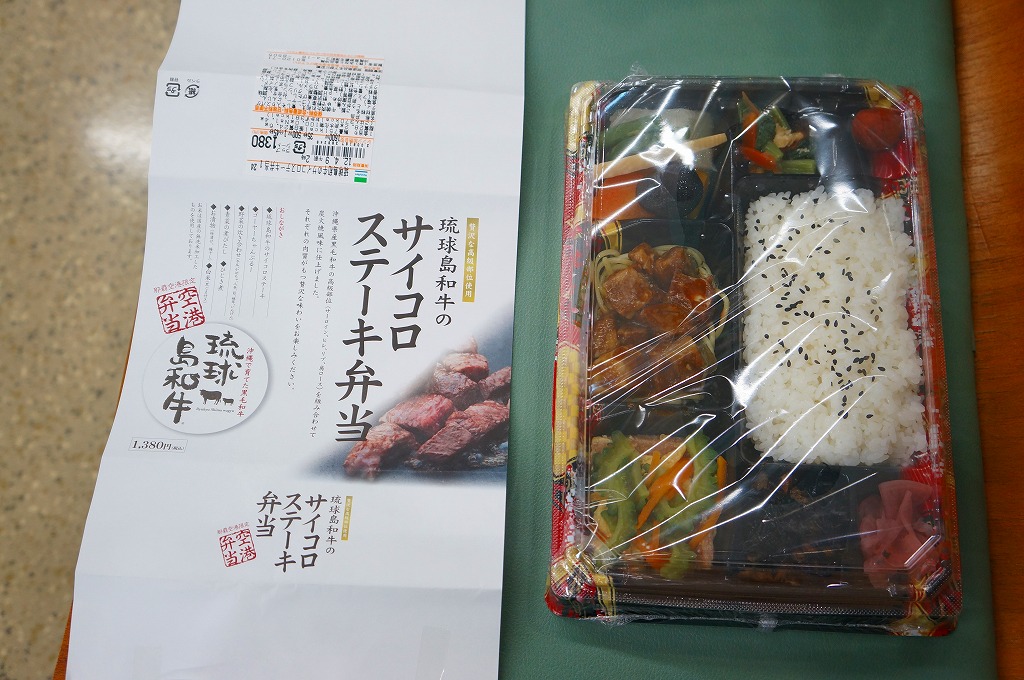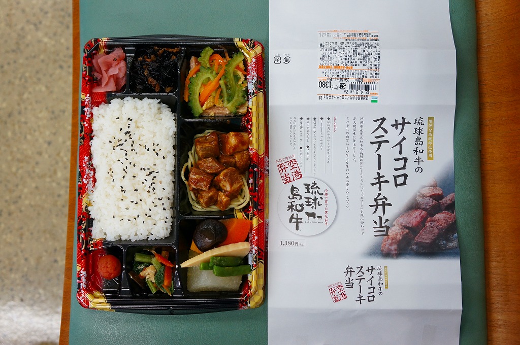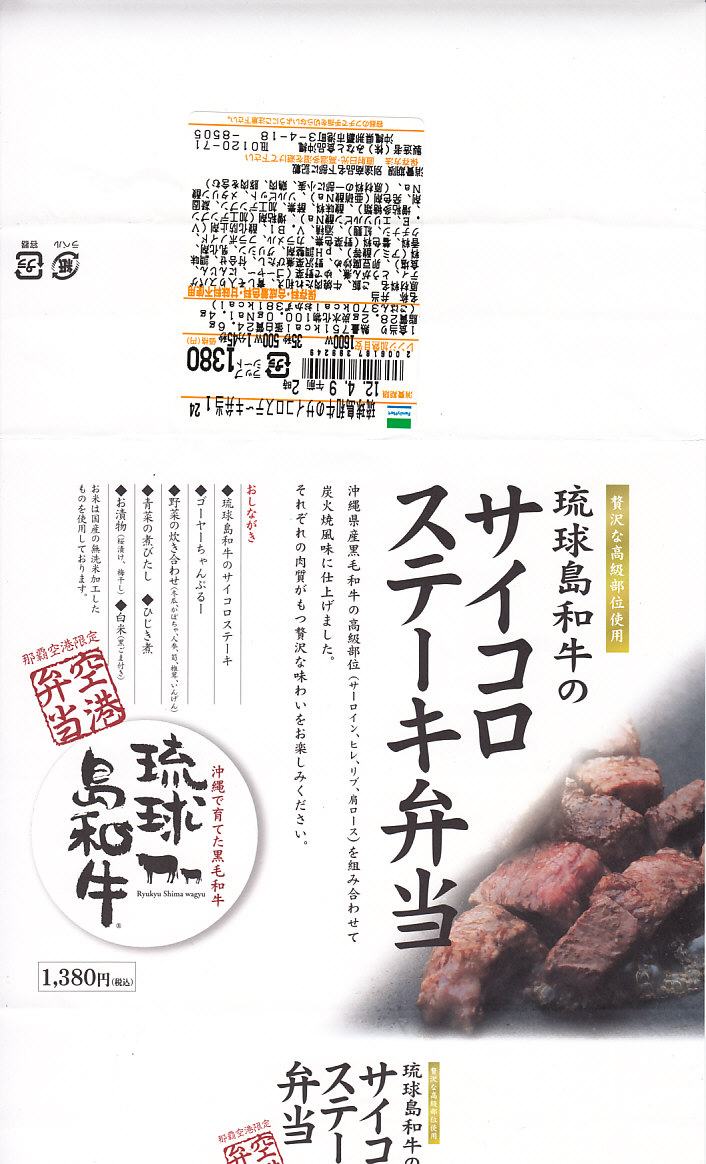 2011年7月12日に「琉球島和牛のゴーヤータコライス」「琉球島和牛のステーキ弁当」「焼鯖寿司」の3種が同時にデビューした、那覇空港のコンビニエンスストア「ファミリーマート」の空弁。手荷物検査場の外で弁当や惣菜が買える店は、ここだけだった。 スーパー向けの長方形のプラ製惣菜容器に、ガリと油味噌を挟んだ焼きサバ寿司が1本、6切れにカットされて収まる。焼きサバそのものが強い味の出る食材であるから、羽田その他の同種商品との差異は感じられなかったような。沖縄や那覇と焼きサバとの関連も分からない。 【那覇空港】1933(昭和8)年8月開港 沖縄県那覇市字鏡水 http://www.naha-airport.co.jp/ 【株式会社みなと食品沖縄】沖縄県那覇市港町3−4−18 0120-71-8505 琉球島和牛のサイコロステーキ弁当(1,380円) 2012年4月8日に那覇空港国内線ターミナルビル内ファミリーマートで購入