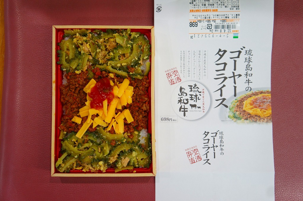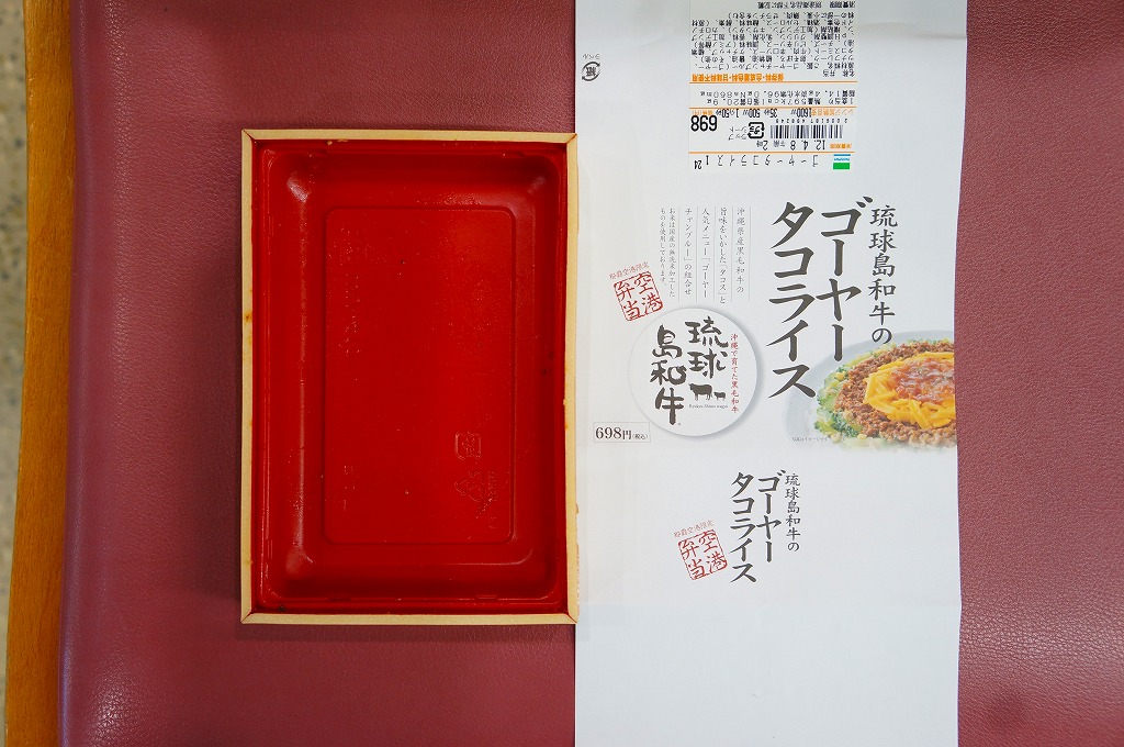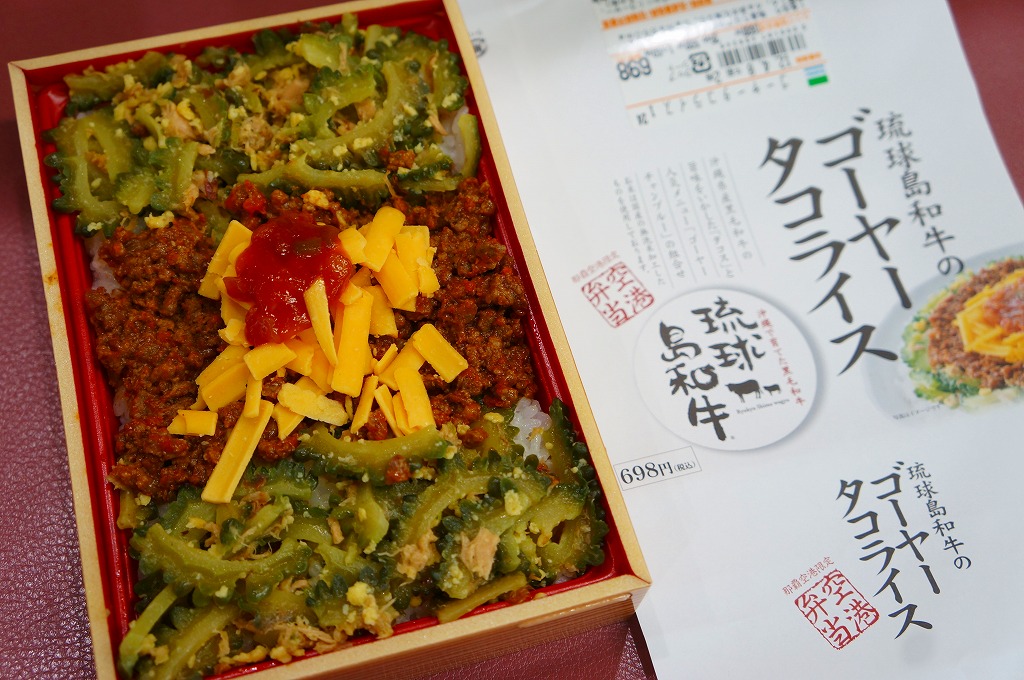 2011年7月12日に「琉球島和牛のゴーヤータコライス」「琉球島和牛のステーキ弁当」「焼鯖寿司」の3種が同時にデビューした、那覇空港のコンビニエンスストア「ファミリーマート」の空弁。手荷物検査場の外で弁当や惣菜が買える店は、ここだけだった。 デパ地下向けのゴツゴツした長方形のプラ製惣菜容器の各区画に、白御飯、タレに漬けた牛肉のサイコロステーキ、ゴーヤーチャンプルー、ダイコンやニンジンやシイタケなどの煮物、青菜の煮浸し、ひじき煮、梅干し、大根桜漬などを詰めたもの。コンビニ弁当にしてはとびっきりの高価格であるだけに、霜降り牛肉に混じり合う赤身と脂身の香りや、サクッと切れる爽やかな歯応えが心地良い。炭火焼き風には感じなかったが。 【那覇空港】1933(昭和8)年8月開港 沖縄県那覇市字鏡水 http://www.naha-airport.co.jp/ 【株式会社みなと食品沖縄】沖縄県那覇市港町3−4−18 0120-71-8505 琉球島和牛のゴーヤータコライス(698円) 2012年4月6日に那覇空港国内線ターミナルビル内ファミリーマートで購入