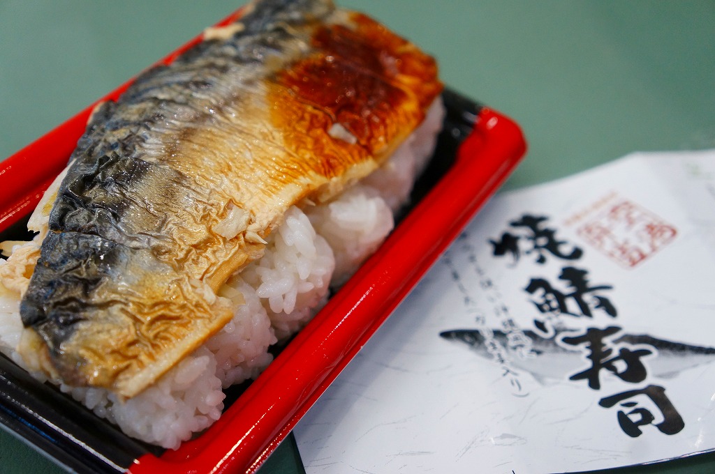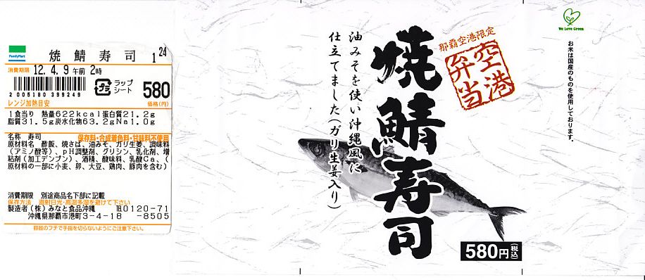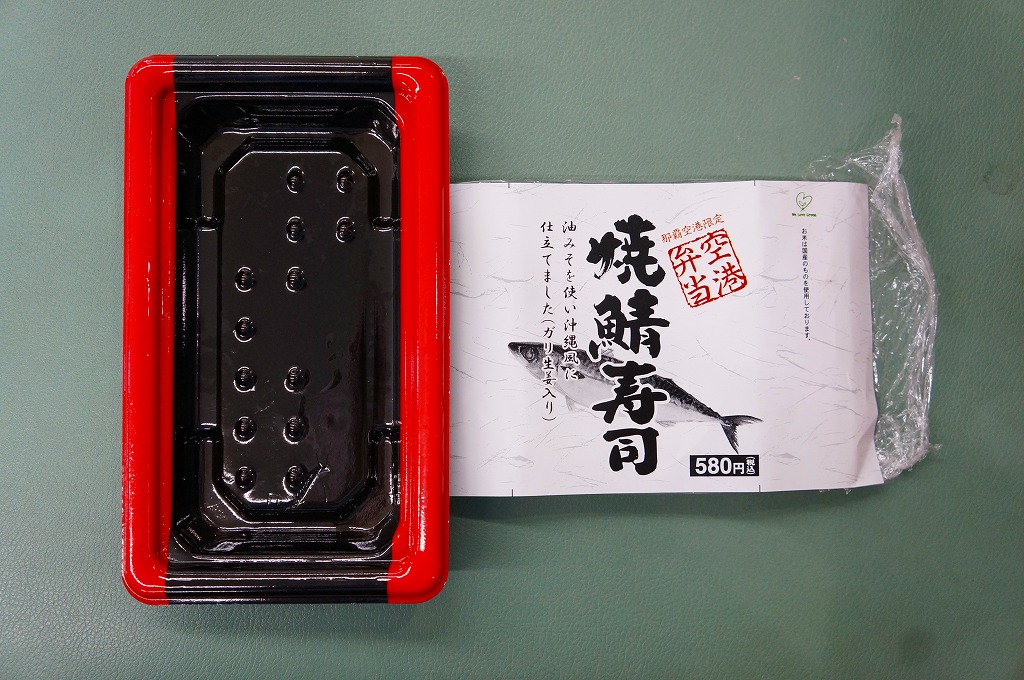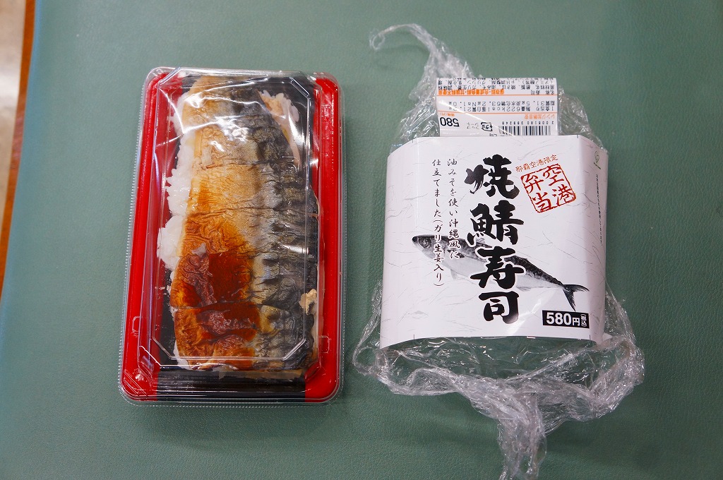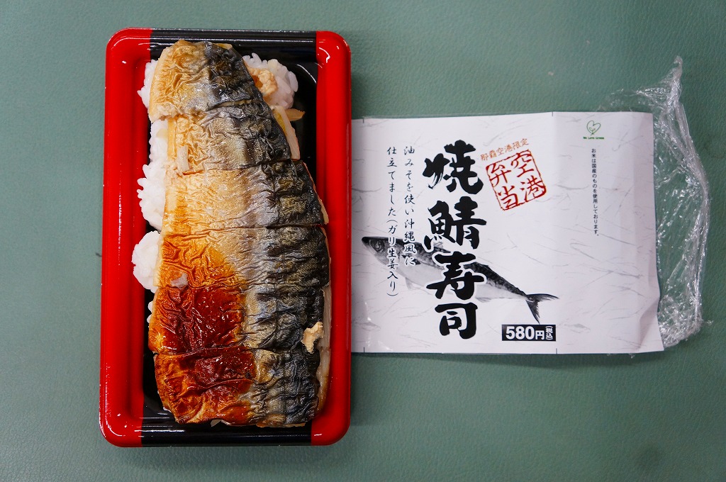 3年ぶりに訪れた那覇空港では、ファミリーマートでの空弁の販売が健在で、手荷物検査場の外で買える空弁はやはりここだけで、そしてコンビニだからか4種の商品すべてが新作に交代していた。この商品は空弁というよりは、ファミリーマートの那覇空港ターミナル店とイオンモール沖縄ライカム店の2店舗で販売する企画商品であるらしい。 中身は商品名と見た目のとおり、ポークと玉子のおむすびが8個並び、たくあんを添えるもの。おむすびはまるで握り寿司のような姿で、シーチキンマヨネーズや油みそやからし菜を仕込んだ俵飯に、肉と玉子の板(ランチョンミート入り玉子焼)を重ね、海苔の帯を巻く。内容は沖縄かもしれないが、味に南国の香りもクセもなく、東京のコンビニでも買えそうな味。 【那覇空港】1933(昭和8)年8月開港 沖縄県那覇市字鏡水 http://www.naha-airport.co.jp/ 【株式会社みなと食品沖縄】沖縄県那覇市港町3−4−18 0120-71-8505 焼鯖寿司(580円) 2012年4月8日に那覇空港国内線ターミナルビル内ファミリーマートで購入