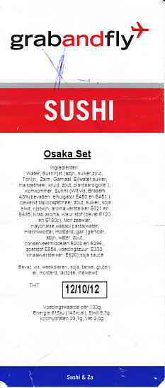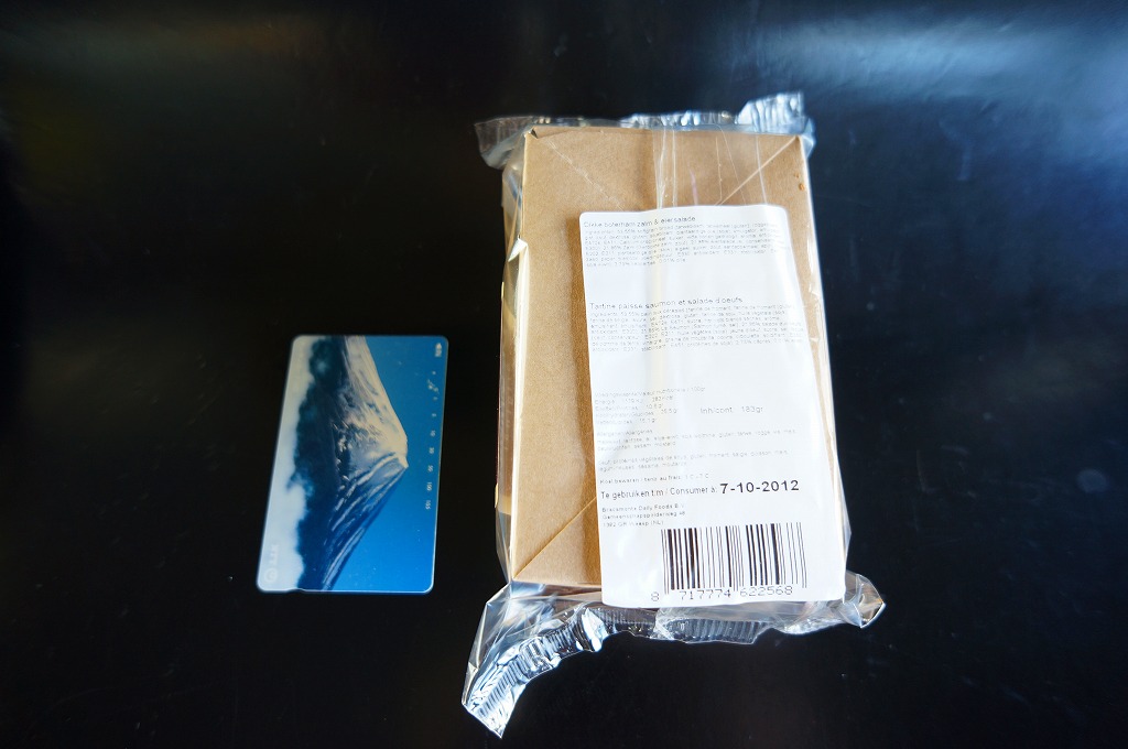 オランダのスキポール空港のターミナルビル内の立ち食い寿司屋「SUSHI BAR」で売られていた持ち帰り商品。日本人を含む店員が目の前で寿司を握ったり、日本の持ち帰り寿司チェーンやデパ地下と変わらない容器と中身で惣菜が売られていたり、ローマ字表記とユーロ表示を除いて、外国にいる気がしなかった。 この陳列品中最高額の商品は、サーモンとマグロが2カンと細巻き3個ずつ。プラ製の惣菜容器も割りばしも、醤油とガリとわさびの小袋も、そして味も、本当に日本そのもの。オランダにある日本の空弁と呼べるかもしれない。 【スキポール空港】http://www.schiphol.nl/ 【SUSHI BAR】 SUSHI Osaka Set(11ユーロ≒1,191円) 2012年10月12日にスキポール空港搭乗待合室売店で購入